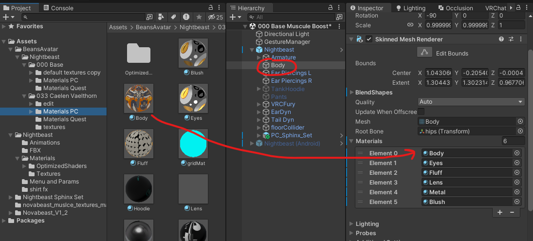 - Swap materials as shown below. For PC, just swapping body, fluffy and eye is enough.
